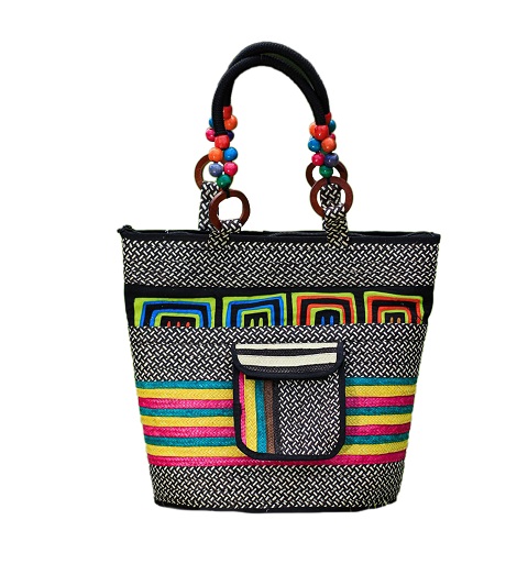 Caña Flecha colored straw handbag, handmade by artisans, classic shape, with Mola fabric and external pocket.
