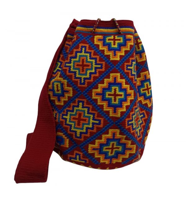 Premium Wayuu Mochila Bag, big size. Handmade with one thread technique, premium quality. With traditional Wayuu geometric design in reds, blue and orange colors; premium strap solid red.