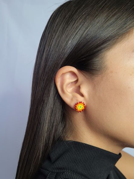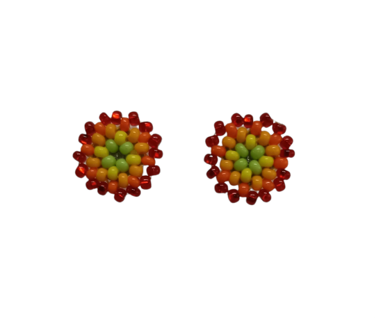 Green, orange and red colored seed bead earrings, polka dot style. Diameter of each one 1 centimeter (0.4 inches)