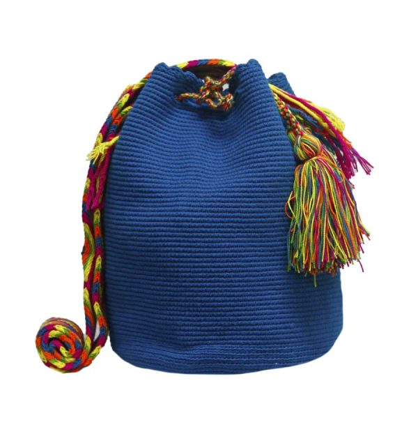 Bolso Mochila Wayuu unicolor, tejida con hilo acrílico técnica dos hilos en crochet por artesanas Wayuu de La Guajira, Colombia. Un solo color azul, faja tejida multicolor. Esta bolsa mochila Wayuu es ideal para quienes prefieren simplicidad en colores y diseño al llevar la mochila.