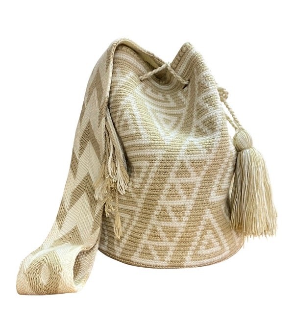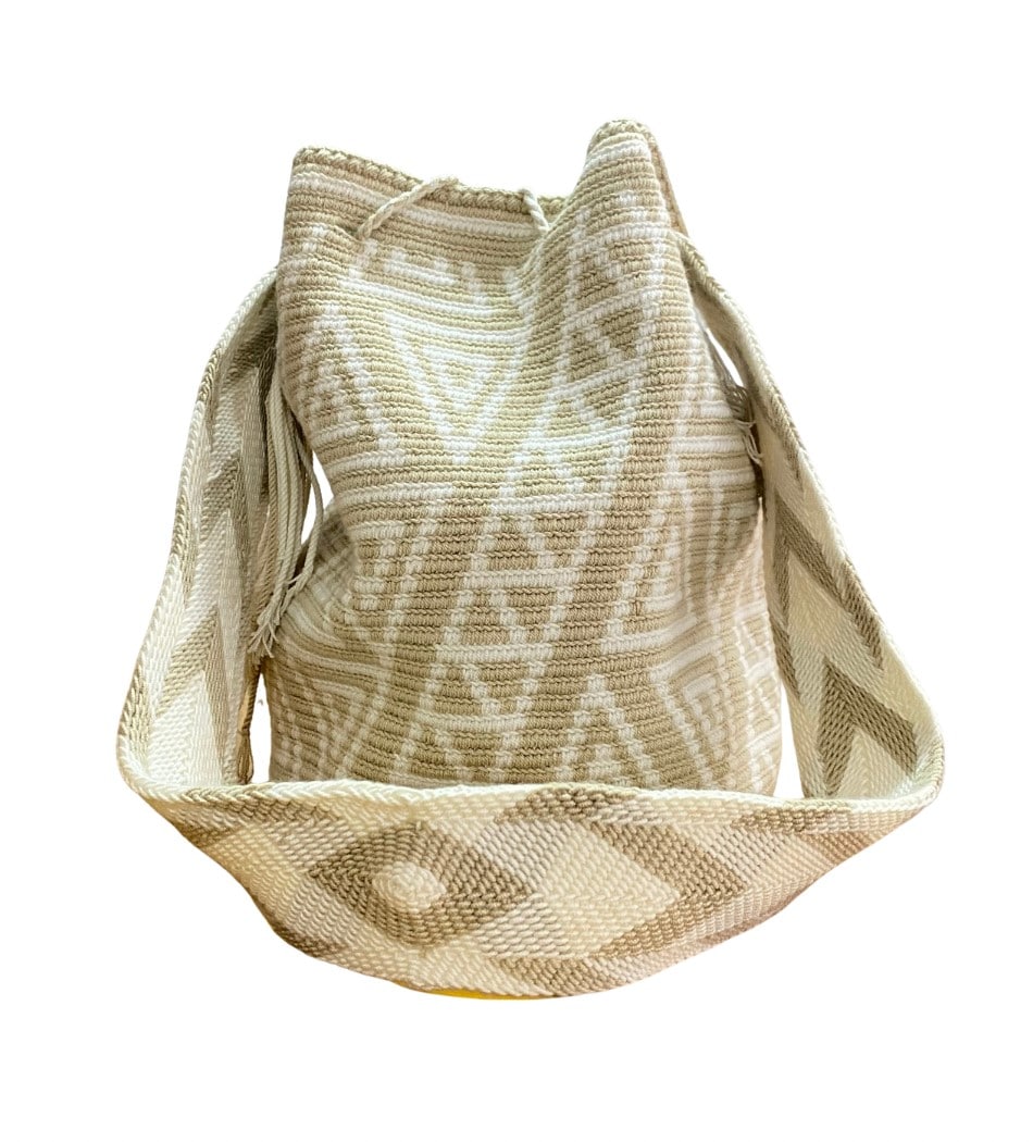Wayuu Mochila Bag, handmade by Wayuu artisans from La Guajira. Colors in beautiful white and beige tones, with traditional geometric designs in triangles of the Colombian Wayuu ethnic group; strap and tassels in the colors of the backpack. Hand-woven with two 100% acrylic threads, crochet technique. Approximate dimensions: bottom diameter 22 centimeters, height 29 cm approx., sash 100 centimeters.