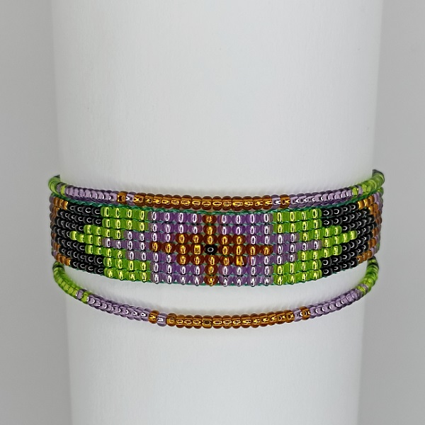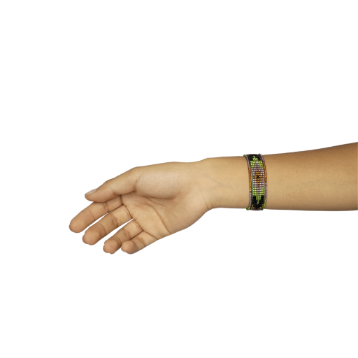 Bracelet with seed beads made by artisans from an indigenous community in southern Colombia, with beautiful lilac and green tones.