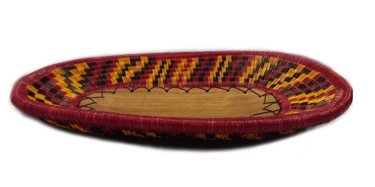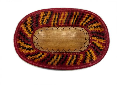 Bandeja Werregue, hecha por artesanos Wounaan del Chocó colombiano, en forma ovalada de madera, bordeada en fibra de werreque, colores de fibra rojo, naranja y negro. Diámetro de ancho 28 cm y de 38 cm de largo.