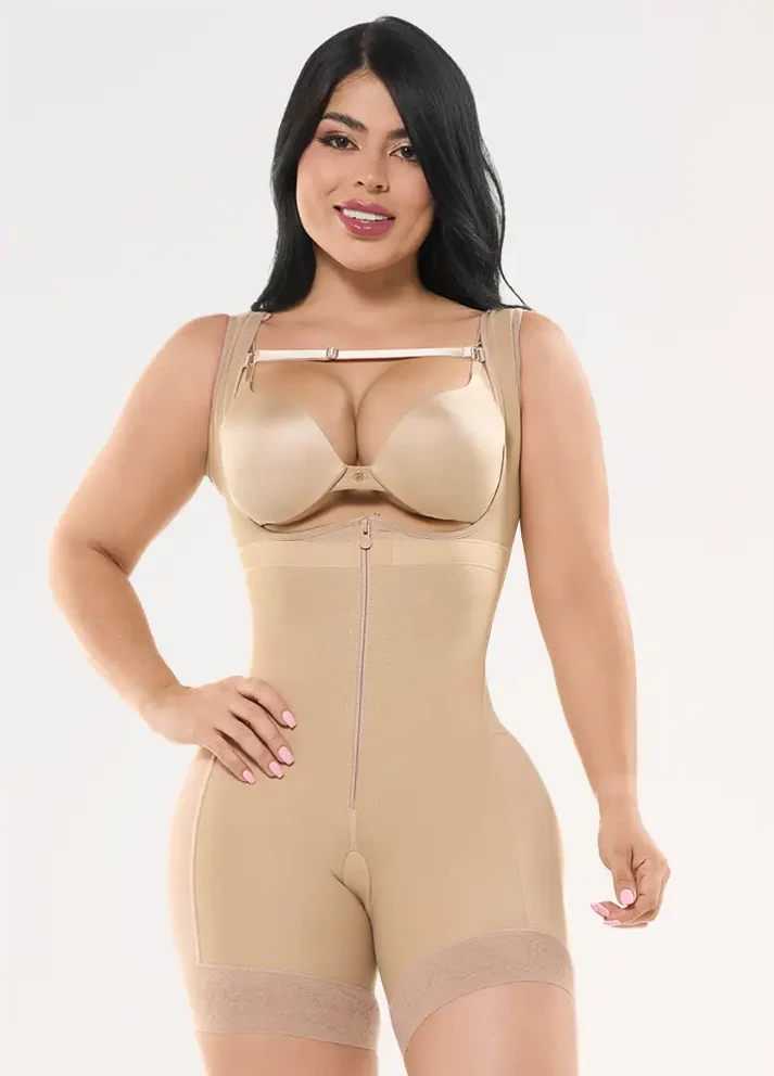 Faja Salomé short 0233-c. Con manga sisa en franela, define y moldea tu figura. Fabricada con dos tipos de tela, la parte exterior es elaborada en Powernet. En la parte interior viene forrada en Franela Lycra Algodón, tela suave al tacto, con broches internos en el cierre y cremalleras planas. Compresión media, abierta en la entrepierna.