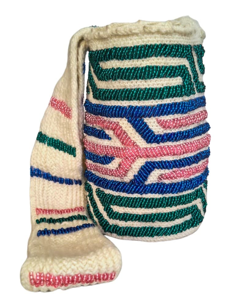 Mochila Kankuama colombiana adornada con piedras chaquiras mostacilla de colores verde, azul y rosado, tamaño mediano, color blanco. Hecha a mano con hilo de lana por artesanas del pueblo Kankuamo de la Sierra Nevada de Santa Marta, faja adornada.